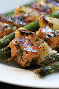 Preheat grill to medium heat. In a mixing bowl, mix the parsley, sesame seeds, black pepper, sea salt, red pepper flakes, maple syrup and olive oil. Mix well. Add the salmon pieces and toss well to coat. Grab your BBQ skewers and slide on a piece of salmon, followed by a folded lemon slice. Repeat until all ingredients are used up and several kabobs are made. Toss asparagus in a splash of olive oil and season with sea salt and black pepper to taste. Place kabobs on one side of the grill and asparagus on the other. Grill both for about 3 – 4 minutes per side, or until salmon flakes with a fork. Remove from the grill and divide between plates. Enjoy!